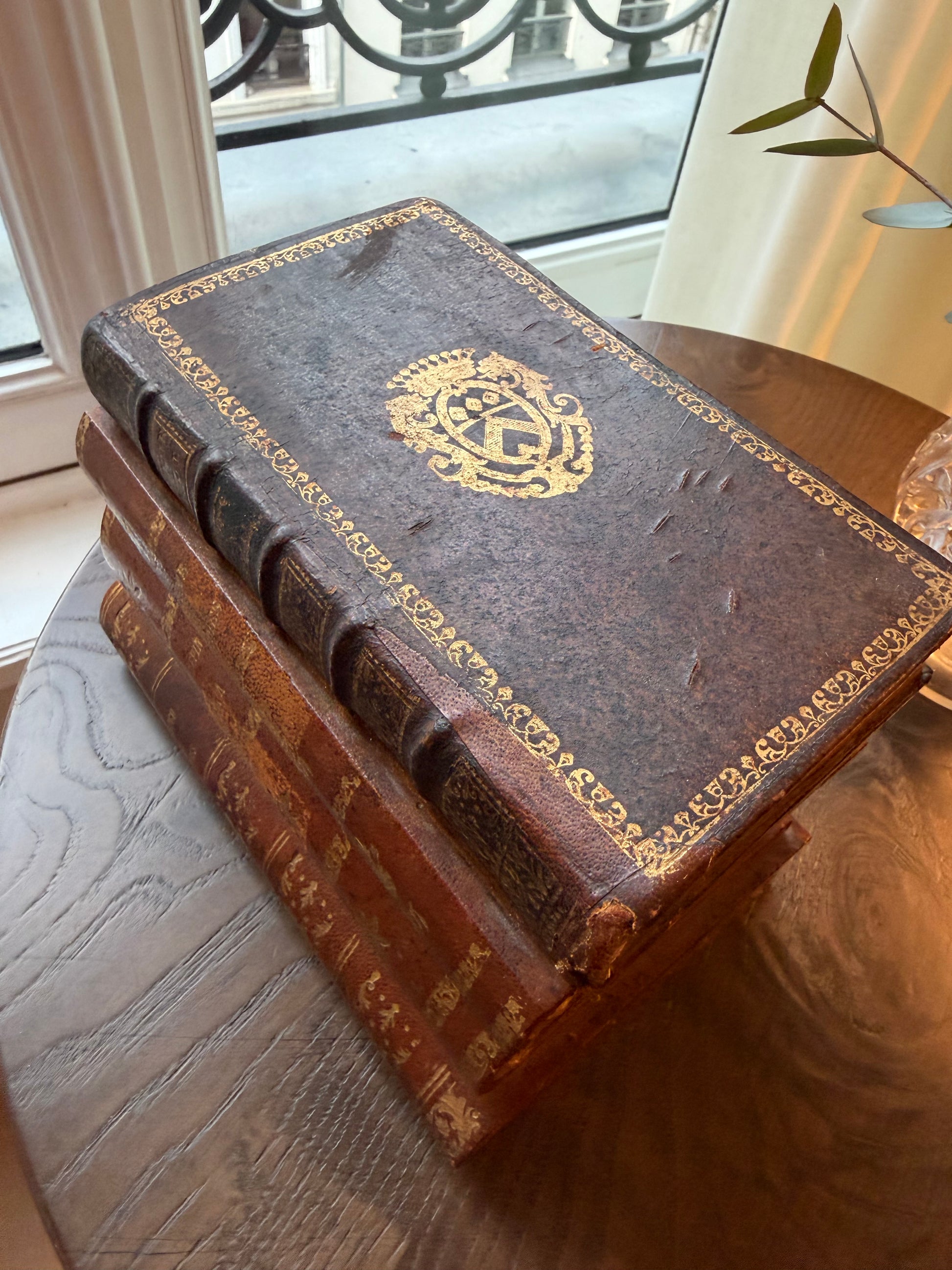 A wonderful French antique leather bound faux book tantalus with fitted interior including a small decanter with stopper and gilt decoration, and four small glasses.